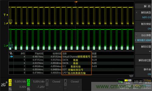 (2)ZDS4054 Plus標(biāo)配512Mpts的存儲(chǔ)深度,且可對(duì)全內(nèi)存數(shù)據(jù)進(jìn)行解碼,MIPI-DSI協(xié)議解碼界面如圖8所示。可通過(guò)事件表查看具體的解碼內(nèi)容,也可以將事件表中的內(nèi)容通過(guò)導(dǎo)出報(bào)表的格式將其導(dǎo)出。