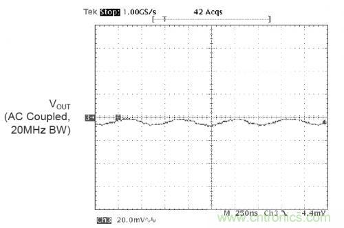 下圖是采用20MHz帶寬限制測試到的電源的紋波以及噪聲。示波器20MHz的帶寬限制是為了防止無源探頭帶入的共模噪聲。可以看到AAT1121BUCK轉換器的紋波噪聲為10mVp-p,幾乎看不到開關噪聲。這主要是歸功于BUCK控制器的低噪聲設計,良好的PCB設計,以及恰當的測試方法。