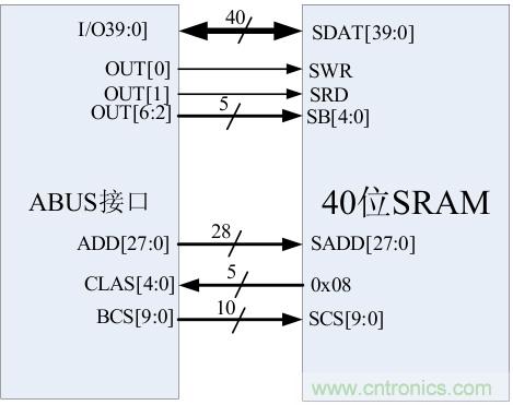 40位SRM模塊與NIOSII通過ABUS連接,實現正確的時序讀寫操作。測試時,一次只測試8位,分5次完成所有空間的測試。如圖2-4。表4是詳細的信號連接說明。