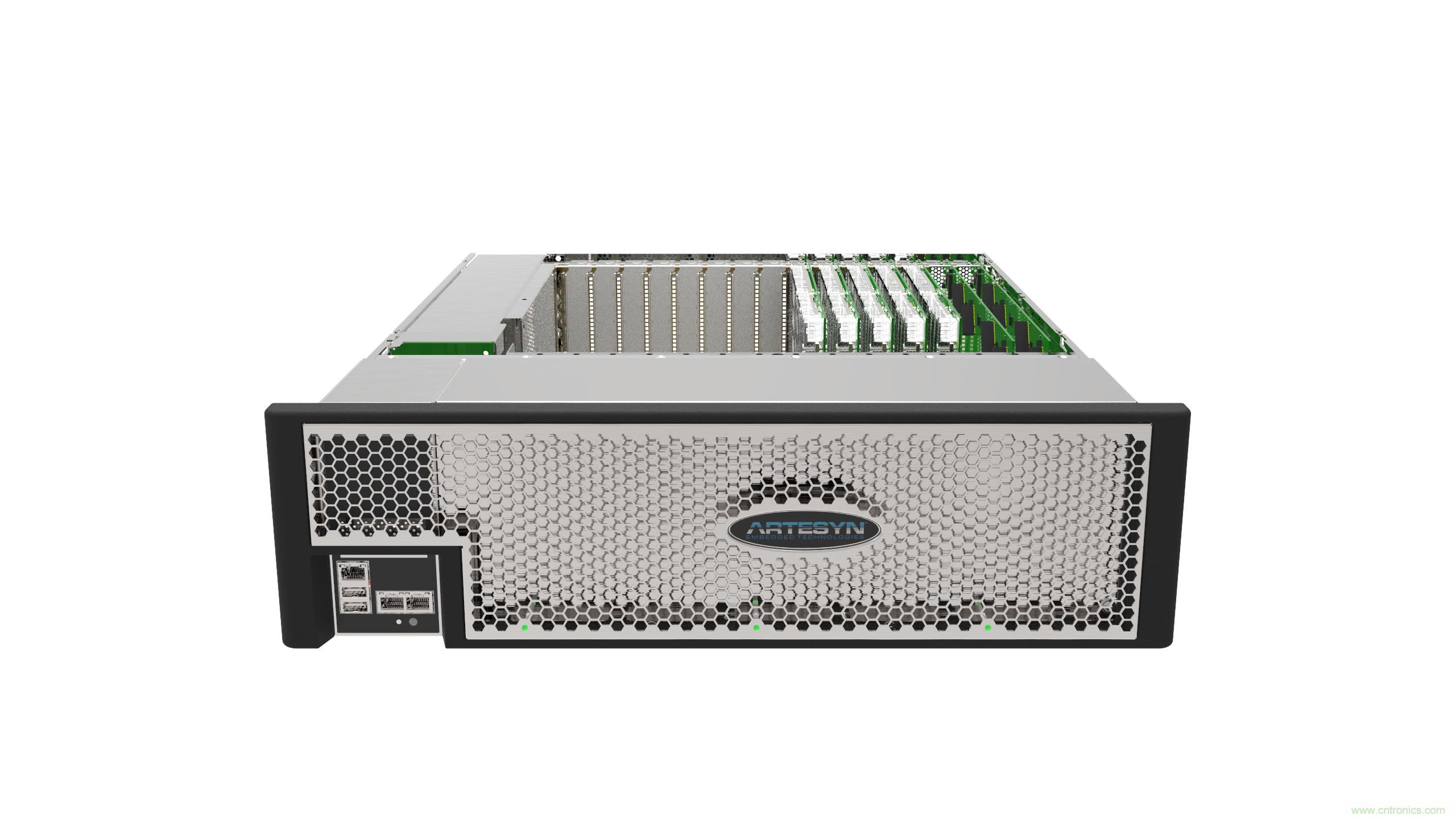 這款3U高(5.25 英寸,133.4mm)的MaxCore IPC 平臺只有508mm深,因此可安裝在19英寸的標(biāo)準(zhǔn)規(guī)格服務(wù)器機(jī)架之內(nèi)。這個系統(tǒng)可采用多達(dá)兩個內(nèi)置式1,100W(交流)電源,為每一PCIe插槽可提供高達(dá)150W的功率輸出。這個計算服務(wù)器平臺最多可裝設(shè)3個1,100W的電源,讓系統(tǒng)有足夠的冗余供電。此外,這個平臺即使在40攝氏度的溫度環(huán)境下以高達(dá)1,800W的輸出功率操作,其散熱系統(tǒng)也能耗散所產(chǎn)生的全部熱能。