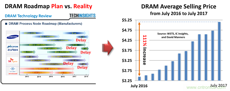圖1:DRAM發(fā)展藍(lán)圖的計(jì)劃與現(xiàn)實(shí)。(來(lái)源:WSTS、IC Insights、David Manners)