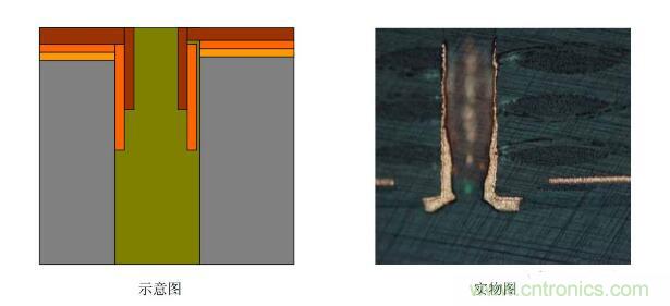 5.圖電孔無銅:斷口處圖電層未將板電層包住―――圖電層與板電層厚度均勻,斷口處齊斷;圖電層呈拉尖趨勢直至消失,板電層超過圖電層繼續延伸一段距離再行斷開。