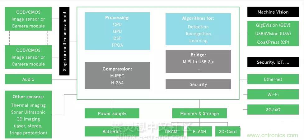 作為系統的輸入CMOS和CCD是目前圖像采集采用的兩種領先技術,CCD能夠提供更高的圖像質量,但是經過過去10年的發展CMOS與其的差距也越來越小了,在功耗、成本和功耗方面大有超過CCD之勢。此外很多應用都需要高效的并行處理系統,因此需要采用專用的硬件處理器比如GPU、DSP、FPGA和多核(multi-core)SoC,但是這無疑會增加系統的成本、功耗和PCB尺寸等,因此一款經濟高效的處理器也是行業所需。當然在實際應用中我們要根據系統的實時性能、功耗、圖像精度和算法復雜度來選擇合適的處理器。
