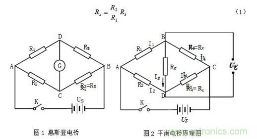 惠斯登電橋(平衡電橋)的原理如圖1所示,調節R3使檢流計G無電流流過時,C、D兩點等電位,電橋平衡,從而得到