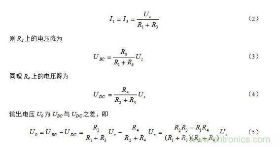 當滿足條件R2R3 = R1R4時,電橋輸出U0=0,即電橋處于平衡狀態。為了測量的準確性,在測量的起始點,電橋必須調至平衡,稱為預調平衡。預調平衡可使輸出只與某一臂的電阻變化有關。若R1、R2和R3固定,R4為待測電阻,當R4因外界條件變化(如溫度t)而變為R4+△R時,此時因電橋不再平衡而產生的輸出電壓為
