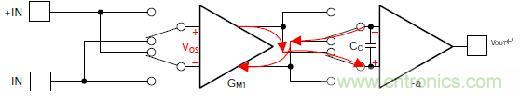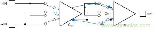 斬波零漂移放大器的內部結構可以具有與連續(xù)時間放大器一樣多的級數——主要區(qū)別在于第一級的輸入和輸出具有一組開關,用于在每個校準周期內反轉輸入信號。圖3顯示了前半個周期。在前半周期,兩組開關都配置為翻轉輸入信號兩次,但失調翻轉一次。這使輸入信號保持同相,但失調誤差極性相反。