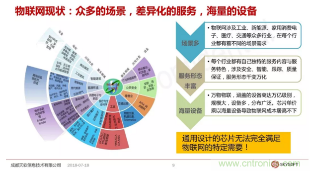 天軟信息在NB-IoT這個(gè)產(chǎn)業(yè)鏈上扮演的角色是要打造一個(gè)端到端的運(yùn)營(yíng)方案,從芯片到運(yùn)營(yíng)整體,黃總指出,通用設(shè)計(jì)的芯片無法滿足物聯(lián)網(wǎng)的特定需要,物聯(lián)網(wǎng)是一個(gè)海量兼容的設(shè)備,不同領(lǐng)域的設(shè)備有著完全不一樣的形態(tài)要求,所以提出了一個(gè)觀念叫做服務(wù)定義芯片。傳統(tǒng)的芯片設(shè)計(jì)行業(yè),芯片設(shè)計(jì)商定義一個(gè)芯片是根據(jù)市場(chǎng)需求和發(fā)展趨勢(shì)來定義這個(gè)芯片的規(guī)格,然后交由芯片制造商去做具體的制造的工藝設(shè)計(jì)規(guī)劃,而現(xiàn)在的模式是把設(shè)計(jì)服務(wù)這塊獨(dú)立出來,也就是說真正了解市場(chǎng),接觸這個(gè)市場(chǎng)對(duì)這個(gè)行業(yè)發(fā)展把握非常精準(zhǔn)的一些公司,他們會(huì)提出來定義具體的一款芯片需求,定義出來的芯片交到以前的芯片設(shè)計(jì)公司來完成設(shè)計(jì)的服務(wù),芯片制造商來完成這個(gè)芯片的制造,天軟信息現(xiàn)在正在走的就是這樣的模式。