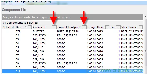 2、如圖1-2可見,原理圖中涉及到的元器件都在“Component List”里面進行了顯示,點擊“Current Footprint”,可對同類型的封裝進行集中排序,方便我們設計者按照封裝庫類去檢查封裝的完整性,若某個器件沒有添加封裝,會優先在前排顯示處理。