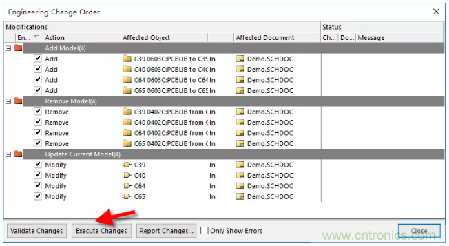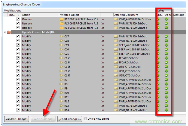 4、對封裝進行完編輯或添加等操作之后,執行右下角的“Accept Changes(Create ECO)”命令,對更新內容點擊“Execute Changes”更新到原理圖當中,如圖1-4。