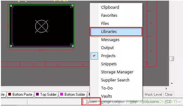 1、首先,指定庫路徑前,要刪除PCB中已關聯的系統庫,打開PCB界面,單擊右下角“System”菜單中的“Libraries”按鈕,可調出如圖1-5所示庫編輯頁面。