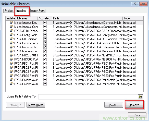 2、如圖1-6所示,單擊“Libraries”按鈕,進入庫的安裝編輯界面,在圖中選擇“Installed”下的所有封裝庫,再單擊“Remove”按鈕,完成系統關聯庫的移除操作。