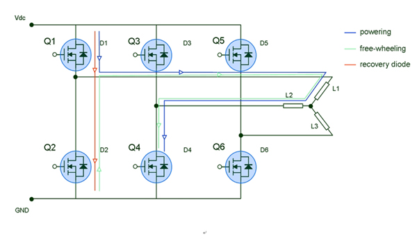 步驟1)功率級同時給兩個相位供電,而對第三個相位未供電。假設供電相位為L1、L2,L3未供電。在這種情況下,MOSFETQ1和Q2處于導通狀態,電流流經Q1、L1、L2和Q4。