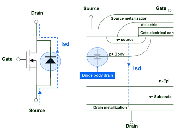 圖2:MOSFET器件的截面圖,電流流經其內部的體二極管[page]