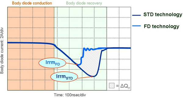圖3:具有快速體二極管恢復特性MOSFET,反向恢復峰值電流較小,恢復時間縮短。