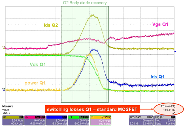 當MOSFETQ1導通時,二極管D2被反向偏置,N區的少數載流子進入P+體區,反之亦然。這種快速轉移導致大量的電流流經二極管,從N-epi到P+區,即從漏極到源極。電感L1對于流經Q2和Q1的尖峰電流表現出高阻抗。Q1表現出額外的電流尖峰,增加了在導通期間的開關損耗。圖4a描述了MOSFET的導通過程。