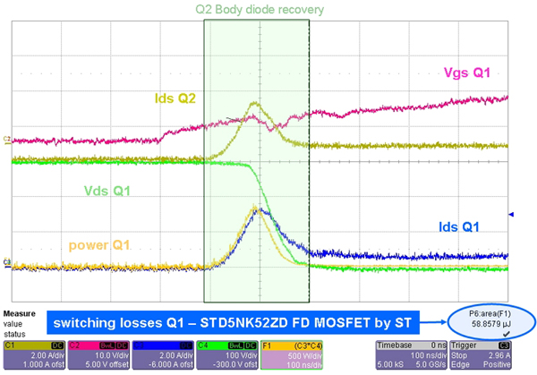 我們對比測試了標準的MOSFET和快恢復MOSFET。ST推出的STD5NK52ZD(SuperFREDmesh系列)放在Q2(LF)中,如圖4b所示。在Q1MOSFET(HF)的導通工作期間,開關損耗降低了65%。采用STD5NK52ZD時效率和熱性能獲得很大提升(在不采用散熱器的自由流動空氣環境下,殼溫從60°C降低到50°C)。在這種拓撲中,MOSFET內部的體二極管用作續流二極管,采用具有快速體二極管恢復特性MOSFET更為合適。