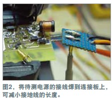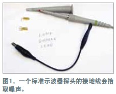 在測量電源軌的紋波時(shí),必須盡量減小噪聲,因?yàn)榧y波幅度可能很小。示波器探頭是基本的測量工具,但它們可能引入噪聲與誤差。地線(如與標(biāo)準(zhǔn)示波器探頭連接的那根線)可能增加一些不會出現(xiàn)在示波器軌跡上的電路噪聲。線路環(huán)就像一根天線,會提取周圍的雜散磁場。環(huán)路面積越大,提取的噪聲就越多。為證明這個理論,可將示波器地線連接到探頭尖端,然后到處移動。示波器會隨著地線的移動而顯示出噪聲的增減。用一個示波器探頭及其地線和插座可以做一個簡單的連接板(圖1)。