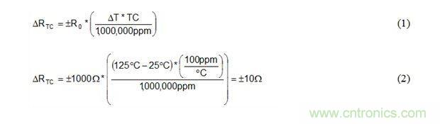 公式1和公式2是溫度從25°C到125°C變化時,如何使用電阻器TC規范計算1kΩ、±100ppm/°C電阻器阻值ΔRTC變化的實例。