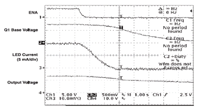 ENA 信號在電路斷開時下降,此時 D2 會阻止 C4 放電。TPS61040 保持開啟狀態,直到 C4 通過 R5 放電。在 TPS61040 仍為開啟狀態時,C3 開始通過 R3 和 R4 放電。隨著 Q1 可用基線電流 (base current) 的下降,Q1 的有效電阻開始升高。隨著 FB 引腳上總電阻的升高,LED">LED 電流會成比例下降。圖 4 顯示了電路斷開時的相關波形。