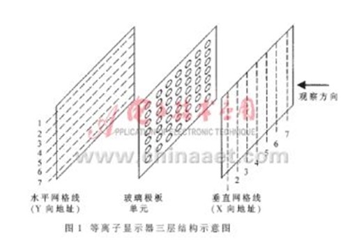 等離子顯示器是一種利用氣體放電的顯示裝置,這種屏幕采用了等離子管作為發(fā)光元件。大量的等離子管排列在一起構(gòu)成屏幕。每個等離子對應(yīng)的每個小室內(nèi)都充有氖氙氣體。在等離子管電極間加上高壓后,封在兩層玻璃之間的等離子管小室中的氣體會產(chǎn)生紫外光,從而激勵平板顯示器上的紅綠藍三基色熒光粉發(fā)出可見光。每個離子管作為一個像素,由這些像素的明暗和顏色變化組合,產(chǎn)生各種灰度和色彩的圖像,與顯像管發(fā)光相似。等離子體技術(shù)同其它顯示方式相比存在明顯的差別,在結(jié)構(gòu)和組成方面領(lǐng)先一步。其工作機理類似普通日光燈,等離子顯示器的三層結(jié)構(gòu)如圖1所示。一般由三層玻璃板組成。在第一層的里面涂有導電材料的垂直條,中間層是燈泡陣列,第三層表面涂有導電材料的水平條。要點亮某個地址的燈泡,開始要在相應(yīng)行上加較高的電壓,等該燈泡點亮后,可用低電壓維持氖氣燈泡的亮度。關(guān)掉某個燈泡,只要將相應(yīng)的電壓降低。燈泡開關(guān)的周期時間是15ms,通過改變控制電壓,可以使等離子板顯示不同灰度的圖形。彩色等離子板目前還處于快速發(fā)展階段。