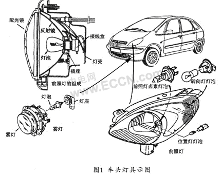 汽車車前燈具如圖1所示。其中的前照燈像人的眼睛一樣,起到畫龍點睛的作用,為汽車增色不少,如圖2所示。
