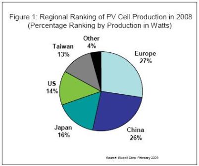 2008年按瓦特數計算,歐洲企業占全球PV電池產量的27%,略高于中國的26%,遠高于日本的16%和美國的14%。
