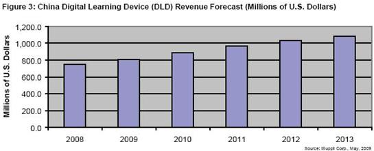 據iSuppli公司,隨著面向新用戶群的新型產品問世,2013年中國數碼學習設備(DLD)出貨額將上升到10億美元以上。DLD是提供數碼學習內容的電子產品。
