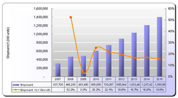 - 2009年估計出貨將僅超過約4.8億片,較2008年微幅成長3.3%;手機采用觸控面板比重將成長到51%。