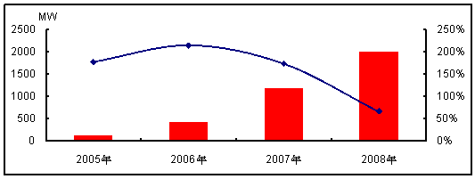 圖 2 2005-2008年中國太陽能電池裝機量