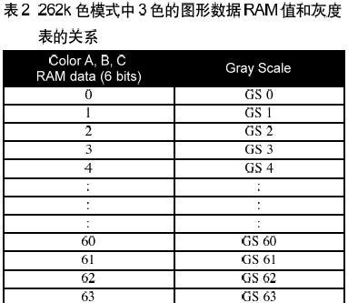 [page]這一單一的灰度表適用于三子色,脈寬的數值由軟件指令輸入。在262k模式,每一顏色包含6-bit,因在262k模式,每一顏色包含6-bit,因此每一顏色都有64階灰度(如表2所示)。