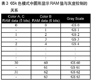 在65K色模式,情形有些不同。如表3所示,從GS0到GS63的64階灰度,有一顏色(顏色B)由6bit組成;而從GS0,GS2,.....到GS62,另外兩個顏色(顏色A和C)只有5-bit,只能呈現32階灰度。