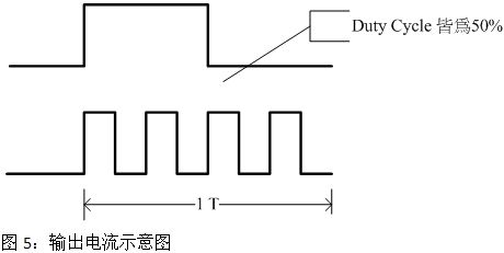 解決LED熱的問題及增加LED的壽命如圖5所示為50%Dutycycle的電流輸出示意圖,若在同一個時間內將出電流的脈沖平均打散,不但不影響輸出電流及LED的亮度也可以避免LED長時間的點亮造成LED過熱及壽命提早衰減的現象。[page]