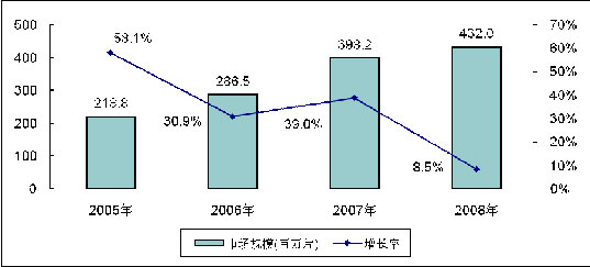 隨著傳統CRT彩電的逐漸被取代,液晶電視的普及已經成為不可逆轉的趨勢,并且普及的速度在不斷加快。中國作為全球最大的彩電制造基地和彩電消費市場,在彩電工業的轉型過程中,液晶電視的產量也出現了爆發式的增長。根據賽迪顧問統計,2005年-2008年,中國液晶電視產量的年均復合增長率高達73.4%,2008年產量達到2411.8萬臺。
