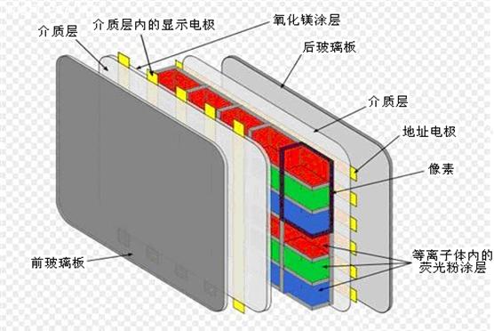 PDP是Plasma Display Panel的簡寫,也就是等離子體顯示器。PDP顯示器的工作原理是,通過加電,讓等離子汽體(一般為惰性氣體)在強電場中放電產生紫外線,然后通過紫外線激發熒光粉發光,PDP顯示器的工作原理如圖5所示,其結構如圖6所示。