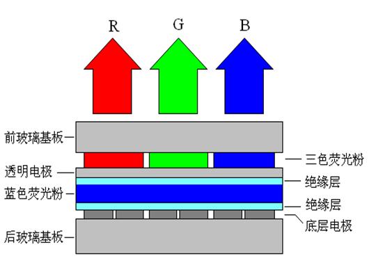TDEL(Thick-film Dialectric Electroluminescent Technology)顯示器的原理是在兩個極板之間(其中一個極板是透明電極),安置一整片藍色場致發光材料,再在其上面再分別安置紅色和綠色顏料,混合成三色的RGB影像。由于不須要像等離子電視一樣復雜的組件,也不須要LCD的背光,37"的TDEL電視樣品厚僅2cm,重量則甚至不到一公斤。從技術性能以及性能價格比方面進行比較,TDEL顯示器要比PDP和LCD顯示器好,應該說是一項比較有發展前途的平板顯示器,但由于產業鏈遲遲建立不起來,所以很少人使用。圖8是TDEL顯示器的工作原理圖。