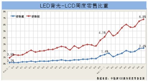 - LED背光電視零售額占整體液晶電視的比重已經從五一期間的0.9%增長到目前的6.8%