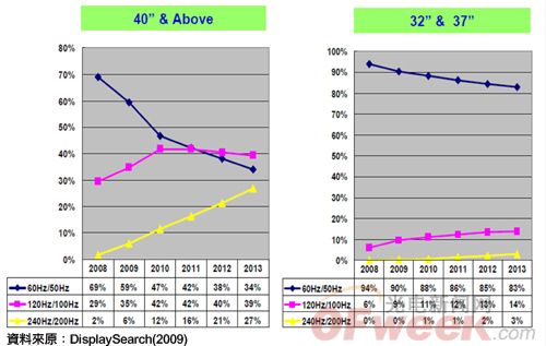 DisplaySearch預估,減少動態模糊(Motion Blur)、達成品牌區隔、消費者喜好及提高毛利率將為帶動120Hz、240Hz液晶面板需求的主要動力,觀察32寸、37寸及40寸以上液晶面板,50Hz/60Hz比重明顯下降;反之,120Hz/240Hz比例有上升趨勢,尤其在40寸以上最為明顯(如圖1)。