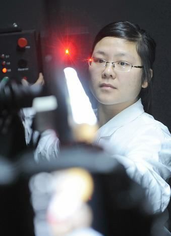 圖:天津工業大學半導體照明工程研發中心的科技人員在測試LED燈光通量大小
