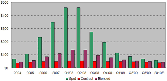 太陽能電池制造商把重點放在降低成本以維持一定獲利率的同時,也將持續推動電價往Grid Parity (太陽發電成本與傳統發電成本相當)的方向進行。主要降低成本的方法包括使用較少的硅,或使用較便宜的硅。多晶硅(Polysilicon)是主要用于制造結晶硅(c-Si)太陽能電池的晶圓材料。而其占到整體太陽能模塊成本的15%到20%。由于大量多晶硅新產能的開出以及過去這一年的需求減少,硅晶的價格自2008年下半年起因供過于求而大幅下跌,目前雖然跌勢已經趨緩,但預計2010年仍為供過于求的狀況,因此價格將持續下降。圖2為多晶硅價格趨勢。