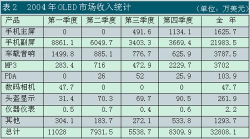 OLED已進(jìn)入的產(chǎn)品領(lǐng)域包括手機(jī)主屏和副屏、汽車音響、MP3、工業(yè)儀表、PDA、車載儀表、數(shù)碼相機(jī)和微顯示器(MicrodisplayforNearEyeApplication)等領(lǐng)域。其中,手機(jī)副屏約為2.2億美元,占67%,汽車音響約為0.38億美元,占11.6%,MP3屏為0.37億美元,占11.3%,這三者共占了約90%。