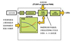使用RGB背光時,當LED溫度改變時,驅動器必須更正紅、綠和藍三主色間的亮度平衡,以防出現(xiàn)白點位移。此外,還需保證驅動器在任何操作溫度下維持光的正確強度。而在補償方面,可以用閉環(huán)或開環(huán)形式。若使用閉環(huán)補償,便需采用感光器來測量白點和其強度。相反地,如使用開環(huán)補償,那溫度便需事先量度出來,并通過預先定義好的補償曲線來調節(jié)亮度的平衡。