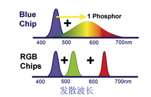 一般而言,小型LCD顯示屏背光照明都是用一組白光LED來實現(xiàn)的。可是,使用白光LED的問題是其光譜對光復制并不是很理想。原因是白光LED其實就是在藍光LED面上加上一層黃色磷光劑。這樣便造成光譜有兩個波峰,一個在藍色而另一個在黃色。圖3給出一個典型的白光LED與RGBLED光譜比較。