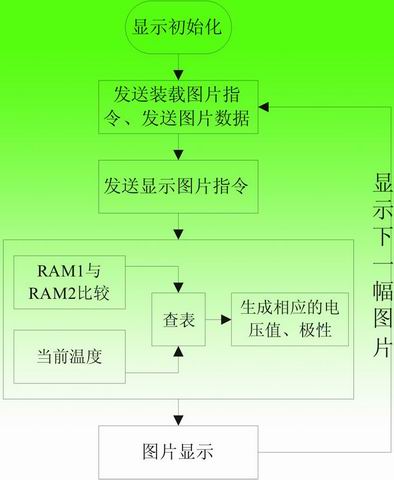 APOLLO驅動電子紙顯示的操作流程如圖4所示。電子紙的顯示依據是要顯示的圖片與當前顯示圖片相比較,得出其差值,再根據當前溫度查詢對應的數據表格,依相應數據輸出驅動。因此在上電后需對電子紙進行顯示初始化,這樣后續的圖片顯示就有較好的基準值。顯示初始化后RAM1數據全置為1,第一幅圖片數據存于RAM2,顯示第一幅圖片時將RAM2與RAM1進行比對,查表顯示輸出;第二幅圖片數據存于RAM1,顯示第二幅圖片時將RAM1與RAM2(存儲當前圖片)進行比對,查表顯示輸出,RAM1即存儲當前圖片;下一幅要顯示的圖片存儲于RAM2中,依次類推,循環執行即可輸出要顯示的畫面。