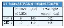 在數(shù)據(jù)表描述的25℃結(jié)溫和350mA的前向電流下,LED2的性能比LED1要好。但是,更實(shí)際的比較將在更高的結(jié)溫下進(jìn)行(見表3)。