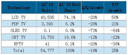 • 2010年第一季所有種類電視機(jī)出貨量較去年同期成長(zhǎng)55%