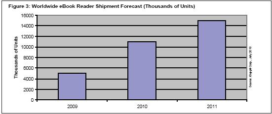 iSuppli公司預(yù)測(cè),2010年全球是電子書閱讀器出貨量將增至1100萬(wàn)個(gè),比2009年的500萬(wàn)個(gè)增長(zhǎng)120%,如圖3所示。目前,iSuppli公司無(wú)意大幅改變這個(gè)短期預(yù)測(cè)。