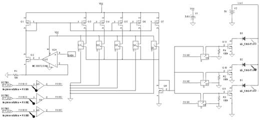 除了DC-DC轉換器,第二個關鍵參數是屬于共同陣列的LED間的電流匹配:RGB結構不能適應LED間的偏置電流差別,因為這些差別會轉化為視頻和圖像顯示中的色彩表現。通過使用如圖3中所示的一套精確的電流鏡,這個問題就得到解決。