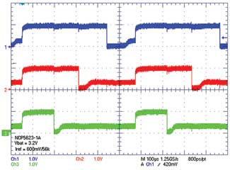 圖5中的波形源自工業(yè)應用,它展示了嵌入在所選器件中的三個PWM的特性。三個LED采用一個共同低頻時鐘控制,并帶有一個占空比設置來適應給定應用。這很明顯能夠獨立地減弱或增強每個PWM,范圍在0~100%的占空比之間,而ILED峰值電流為恒定。