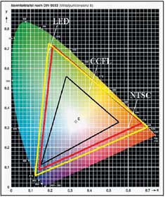圖6LED和CCFL的色域與NTSC標準的比較