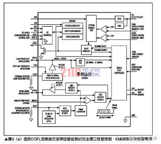 傳統上LCD面板使用CCFL燈管作為背光源,主要是這項技術擁有良好效率、低溫以及高照明能力等優勢,雖然CCFL控制器在非汽車類應用中,例如液晶電視或液晶顯示器上相當成功,但汽車的工作環境卻對這項技術帶來特殊的挑戰與要求,為了讓元件數減少,CCFL控制器必須包含包括如EMI抑制、燈管電流過度驅動(overdrive)能力,以及將接腳數降到最低的串行控制接口、各信道燈管失效監測、燈管頻率與DPWM控制用精確內建振蕩電路以及其它功能等,這類解決方案有美信(Maxim)公司的DS3881,請參考圖3(a),其只需少許的外加電路,就能夠組合出完整的CCFL電源控制子系統,請參考圖3(b)。DS3881主要針對汽車應用環境進行最佳化設計,由于所采用的基礎電路組態,因此外部晶體管、變壓器以及燈管本身就形成了EMI的噪聲來源,DS3881通過使用展頻與頻率偏移技術來降低EMI發射,并將任何未移除噪聲移到非關鍵頻帶來解決這個問題。